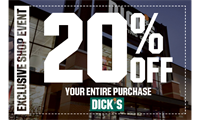 Get 20% off your entire purchaseFriday 1/30 to Monday 2/2, in store at DICK'S Sporting Goods! Details coming soon!